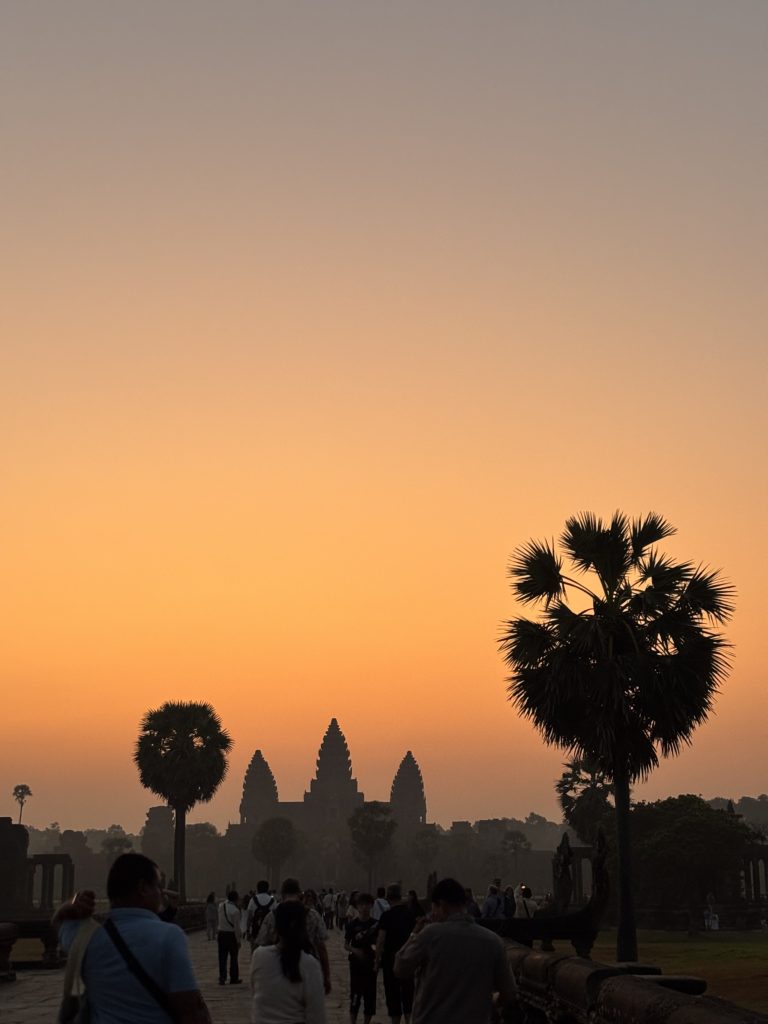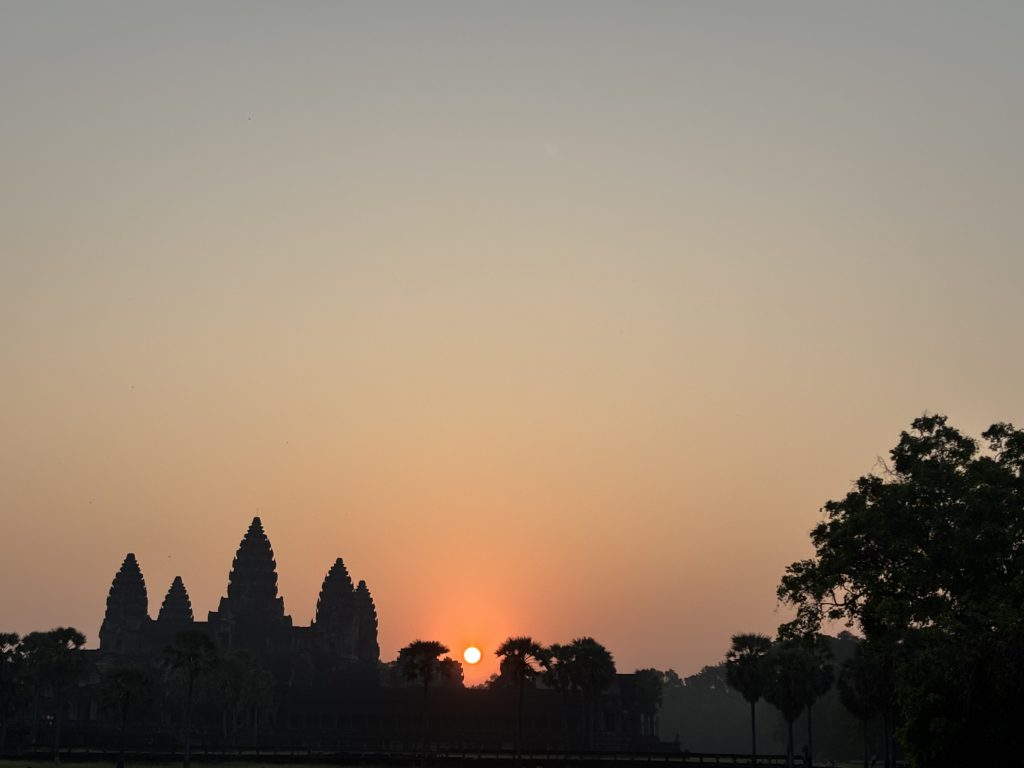 今日はアンコールワットでの日の出を見に行きました。5時にホテルを出たので眠い中でしたが、世界遺産であるアンコールワットでの日の出を見ることができました。とても綺麗で感動し、眠かった目も、頭も覚めました。