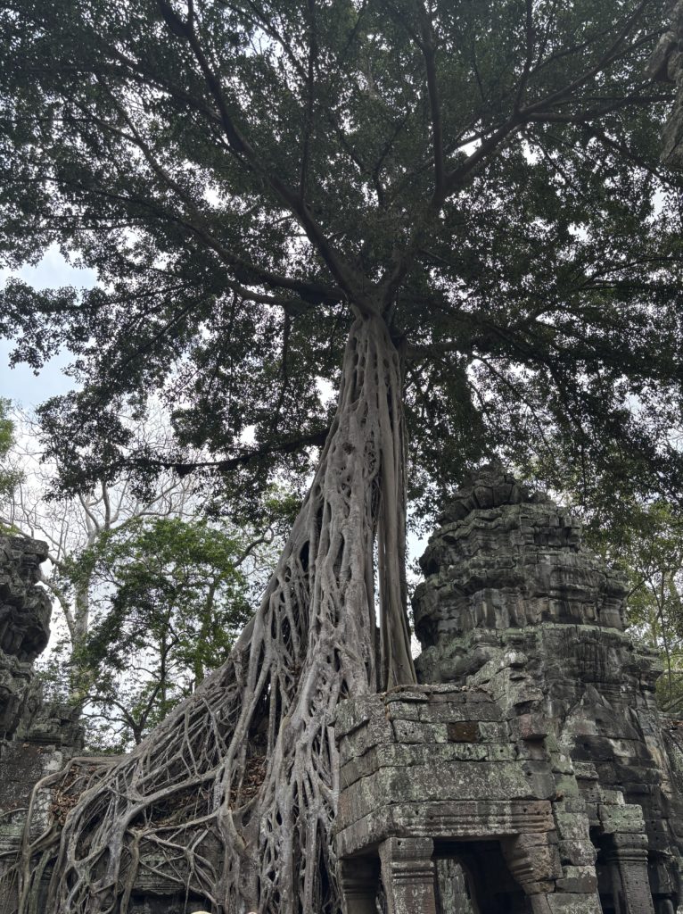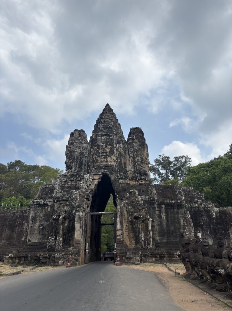 アンコールトムはアンコールワットとは異なり、仏教の城砦の都市でした。昔は周りに家が多くあったそうです。アンコールトムの建物は一直線にレンガを置いていることでアンコールワットよりも崩れているところが多かったです。建造物において建て方は非常に重要で、後世にも強く影響を残すものだと感じました。