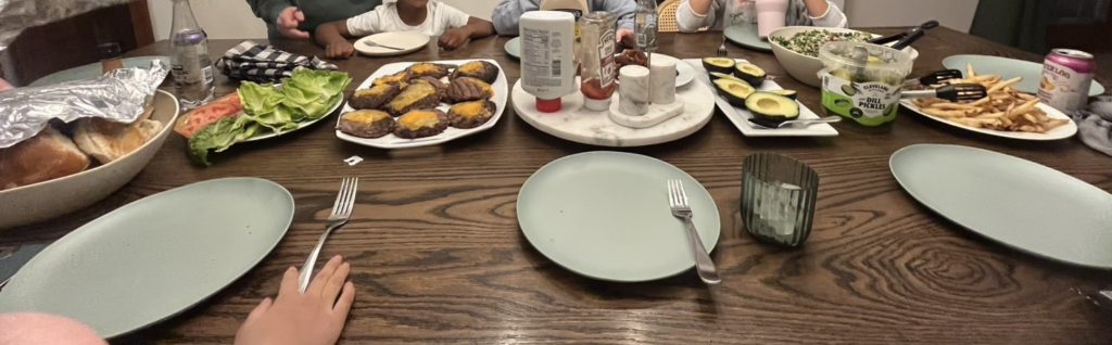 In the evening, we ate hamburgers for dinner. My host father grilled the meat in the garden.