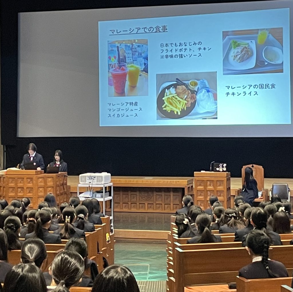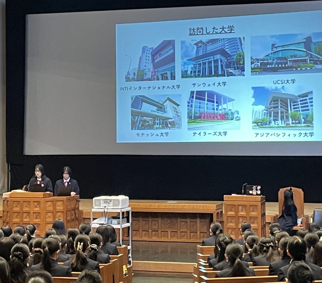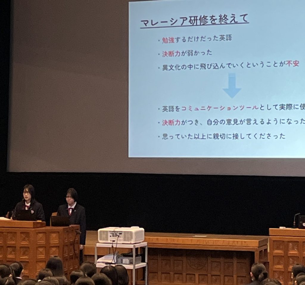 今朝の中学アッセンブリー(生徒集会)では、中学2年生の生徒による「マレーシア大学研修」の報告がありました。