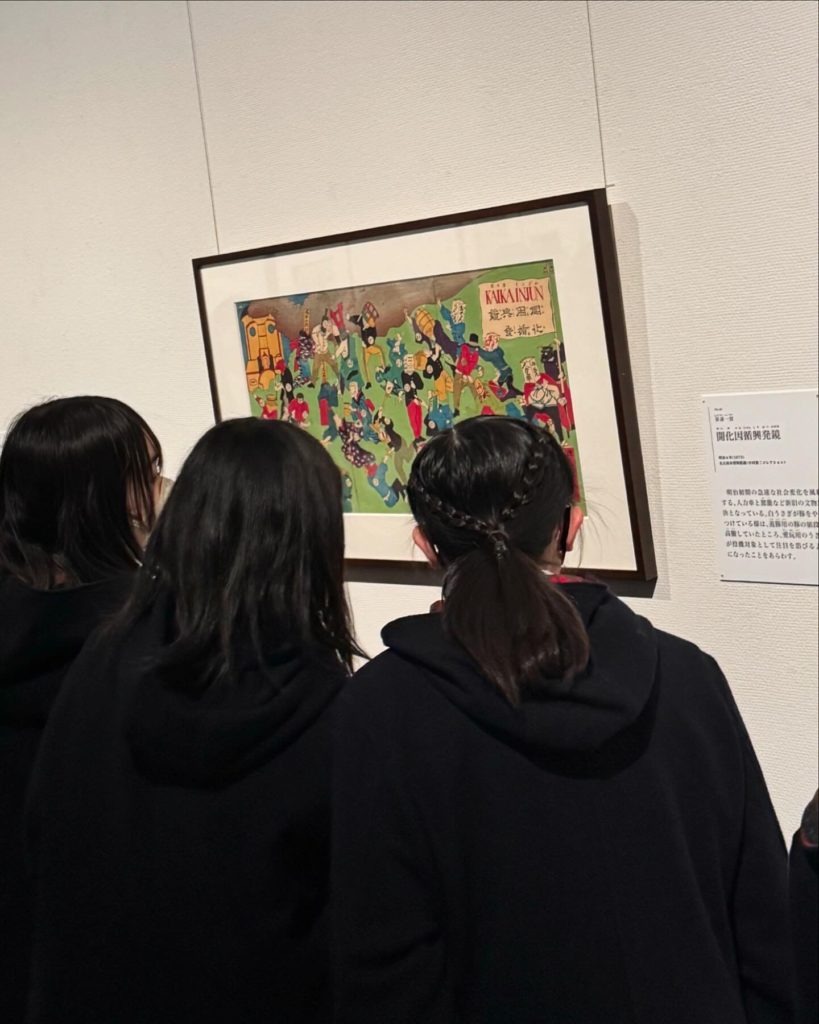広島県立美術館では「もしも猫展」が開催中で、江戸時代の歌川国芳の作品を中心とした、猫の擬人化作品を鑑賞しました。猫が学校に行っていたり、相撲をしていたり、お風呂に入っていたり…江戸時代の有名な歌舞伎をモチーフとした漫画のような作品があったりと、とっても可愛くておもしろい作品がたくさん!生徒たちは食い入るように熱心に見ていました。あっという間に帰校時間となり、時間が足りない!!と残念がる生徒も。