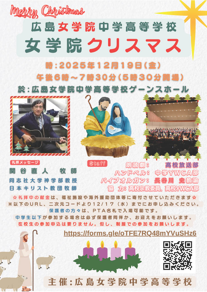 広島女学院では、12月19日(金)に「女学院クリスマス」を開催します。