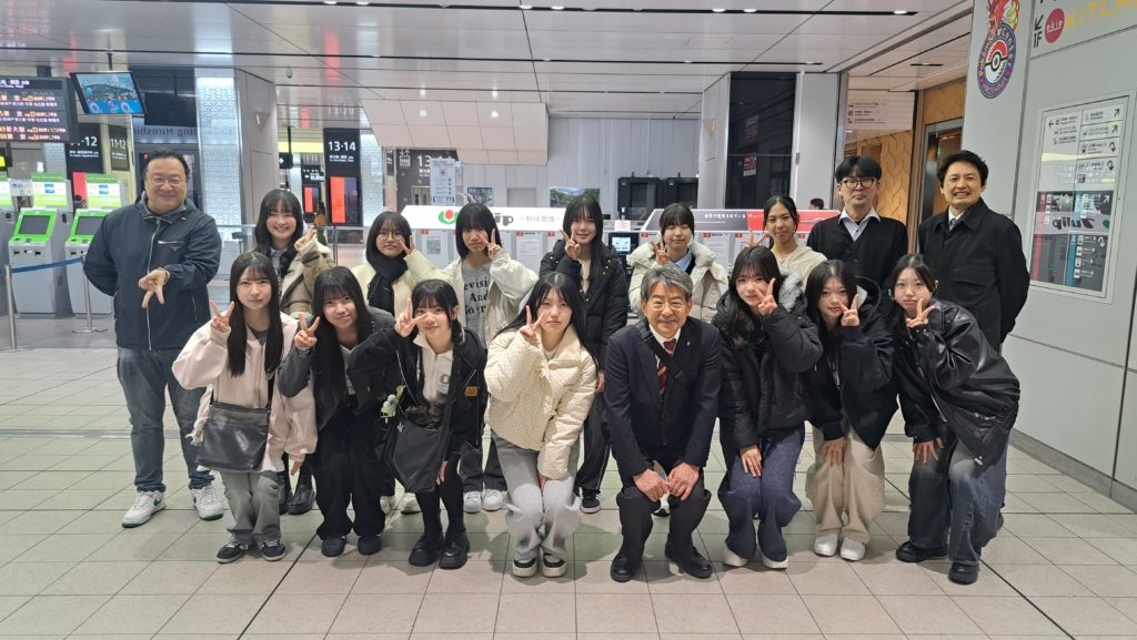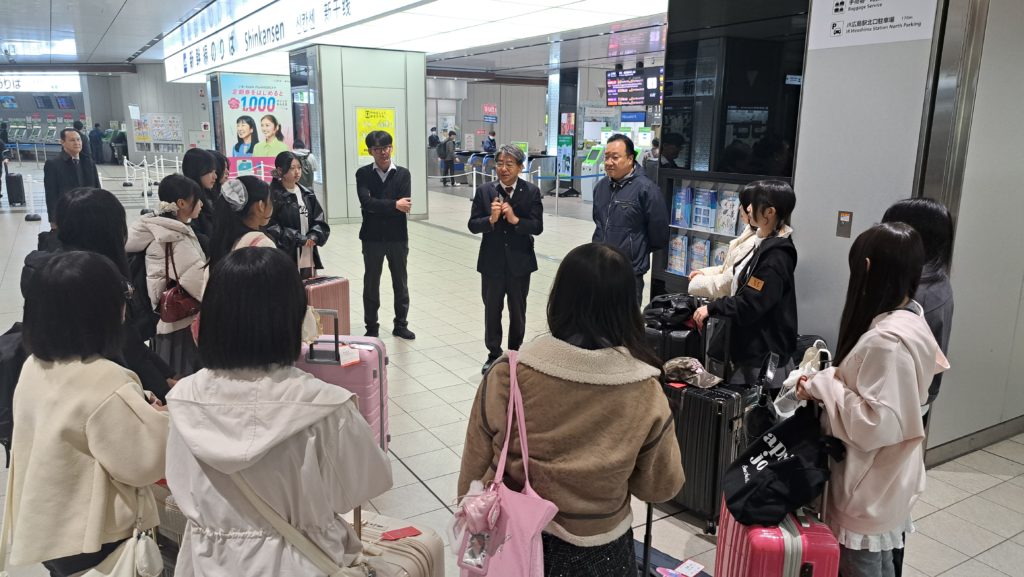 なんと朝6:20に広島駅に集合。出発式には、渡辺校長先生、宇津中学教頭先生が見送りに来て、参加者を激励。