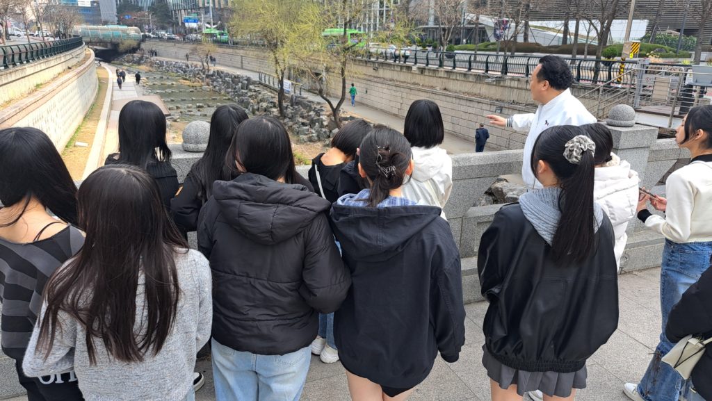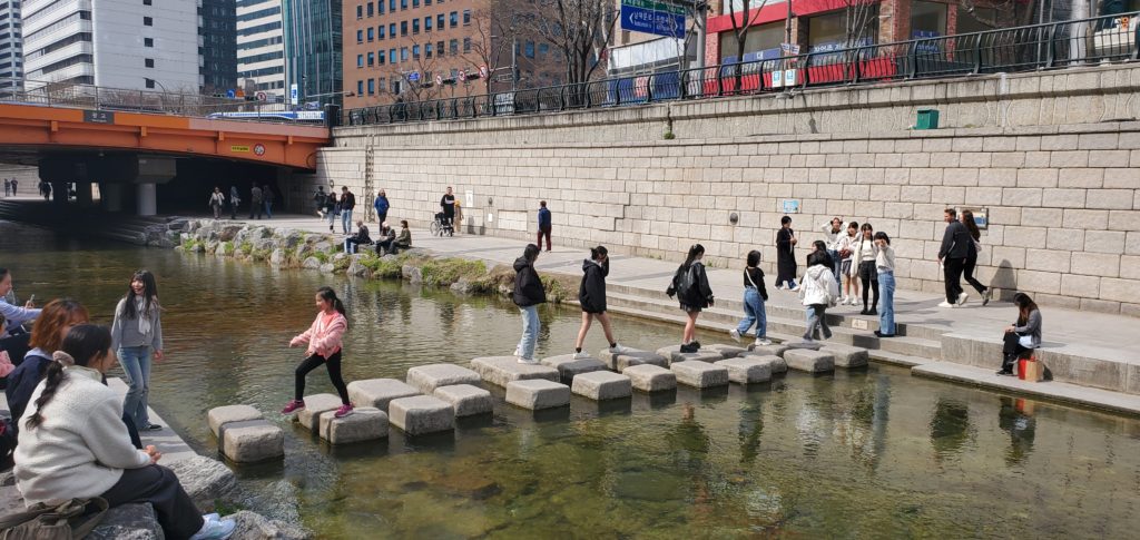 清渓川は、ソウル中心部を流れる全長11kmの人工河川で、ライトアップの美しいデートスポットとのこと。