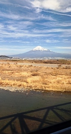 東京に向かう新幹線からは、雪化粧した富士山が🗻