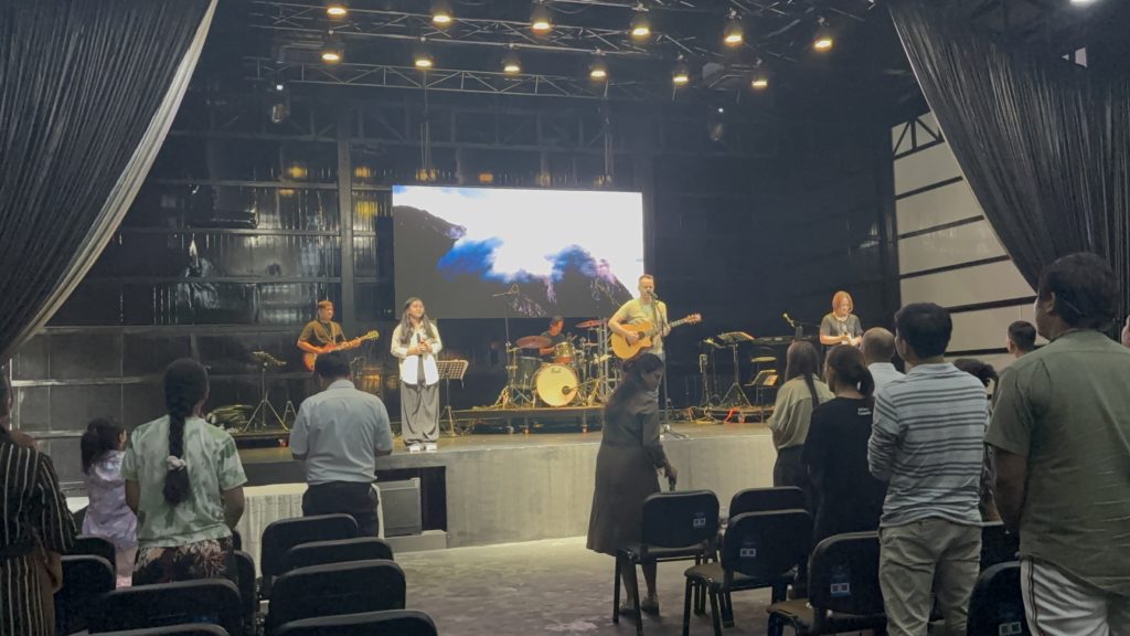 今日は教会に行きました。女学院の礼拝の厳かな雰囲気とは異なり、まるでパーティーのような明るく活気のある雰囲気でした。はじめに、ホストファザーがボーカルを務めるバンドが数曲を演奏し、会場全体が一体となって盛り上がりました。続いてホストマザーが英語で説教を行い、それを現地の方がクメール語に通訳していました。言語が異なる人々にも内容が伝わるよう工夫されており、国や文化の違いを越えて人々がつながっていることを感じました。礼拝の後は、参加していた人たちと一緒に昼食をとりました。クメール料理やマンゴーが振る舞われ、皆で分け合いながら食べる中で、自然と会話も弾みました。その際、日本について多くの温かい言葉をかけていただき、カンボジアの方々の優しさや思いやりを強く感じました。