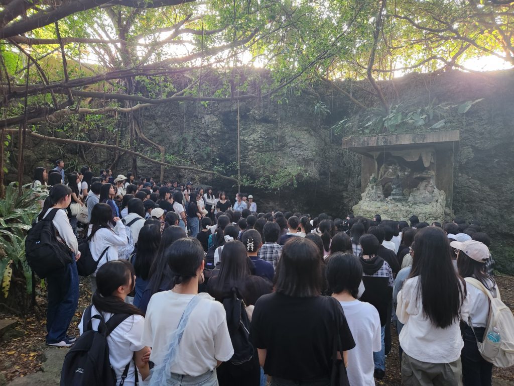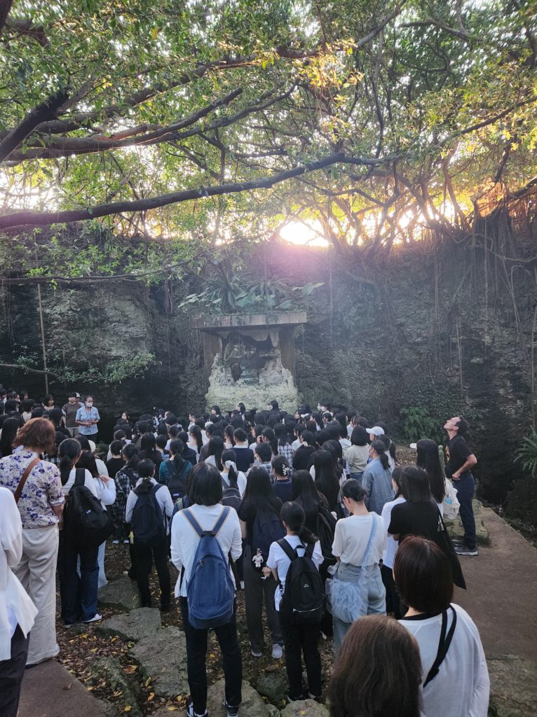 心配された台風も見事に進路を変更し、良いお天気に恵まれ修学旅行がスタートしました。 那覇空港到着後、まずは南部糸満市にある平和記念公園を訪れ、平和の礎そして資料館を見学。 その後読谷村まで移動し、チビチリガマ前で比嘉涼子さんによるお話と黙祷、ホテルに移動して比嘉さんによる講話を聞きました。 比嘉さんの圧倒的な伝えるエネルギーを受け、多くの事実と課題に触れる時間となりました。