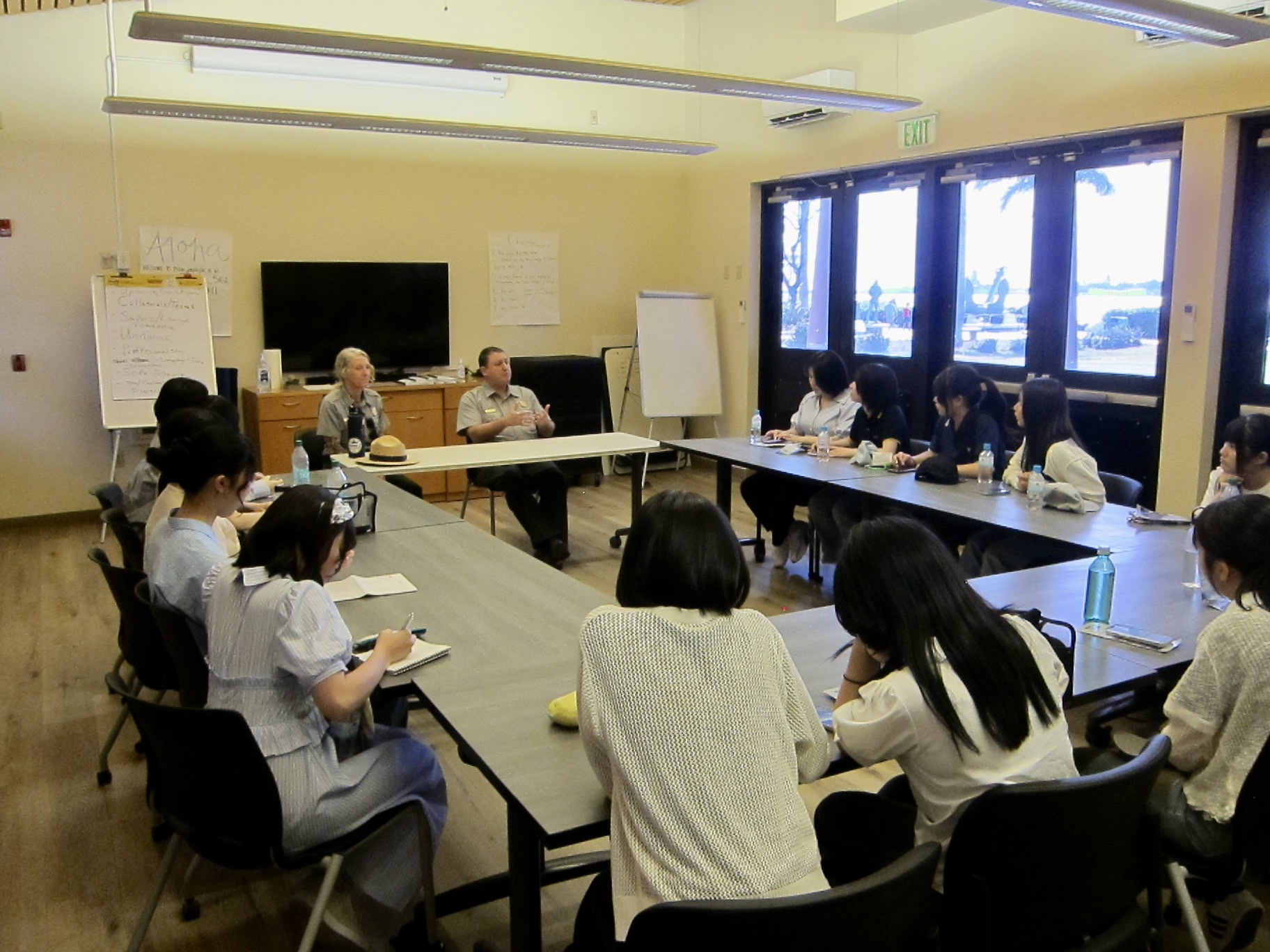 After having lunch, we had a guided tour on the USS Missouri, a retired warship. Inside the ship was the exhibition about navy, what the US was like during World War II. There was also an exhibition about a Kamikaze Unit. Inside the ship, we saw the kitchen and bedrooms, which helped us imagine what the life was like onboard the ship. We also had a discussion with Lead Park Ranger Holly Dobbs and the Superintendent of Pearl Harbor National Memorial, Tom Leatherman. We were able to ask many questions and deepen our understanding.